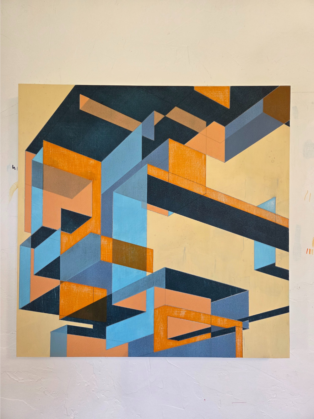 Inspired by cubism and brutalist architecture, Robert uses layers of colorful painting and precise linework to build his abstract architecture. Exploiting the ambiguity of translating three-dimensional spaces in to two-dimensional art, elements compete against their immediate context, but resolve into a larger harmony as they traverse the artwork.