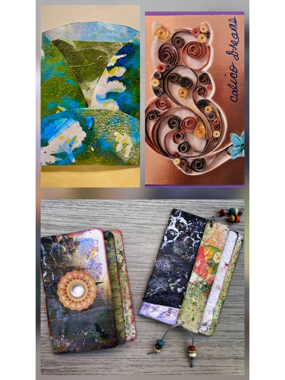 Tacoma Arts and Crafts Group's work reflects connections: Finley’s haunting sculptures and Aird’s sculptural baskets relate us to natural elements. Voss’s fanciful mixed-media ladies and Eiler’s palm-sized gift journals evoke friendship. Reis’s paper quilling and Alch’s crocheted bags preserve traditional crafts. Turner’s ice-dyed accessories and Voss’s vintage quilt wearables imagine old vocations into new expressions.