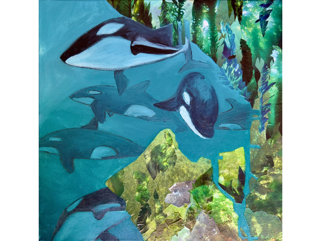 When Siri Tiger Kaunda wades into the cold waters of the Salish Sea and enters into the underwater wilderness, she is continuously captivated by the ever-changing environment and diverse sealife. She uses oils, collage, and mixed media to invite you into this wild world of translucence, depth, and life.